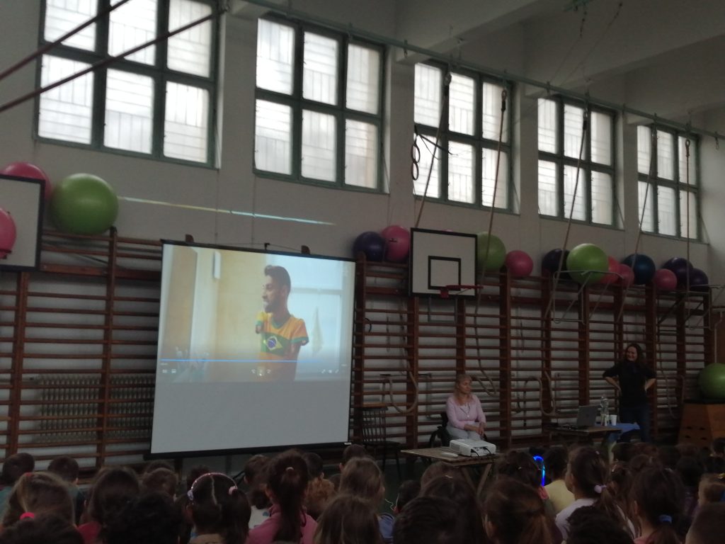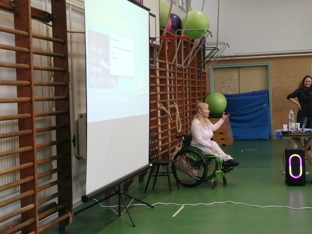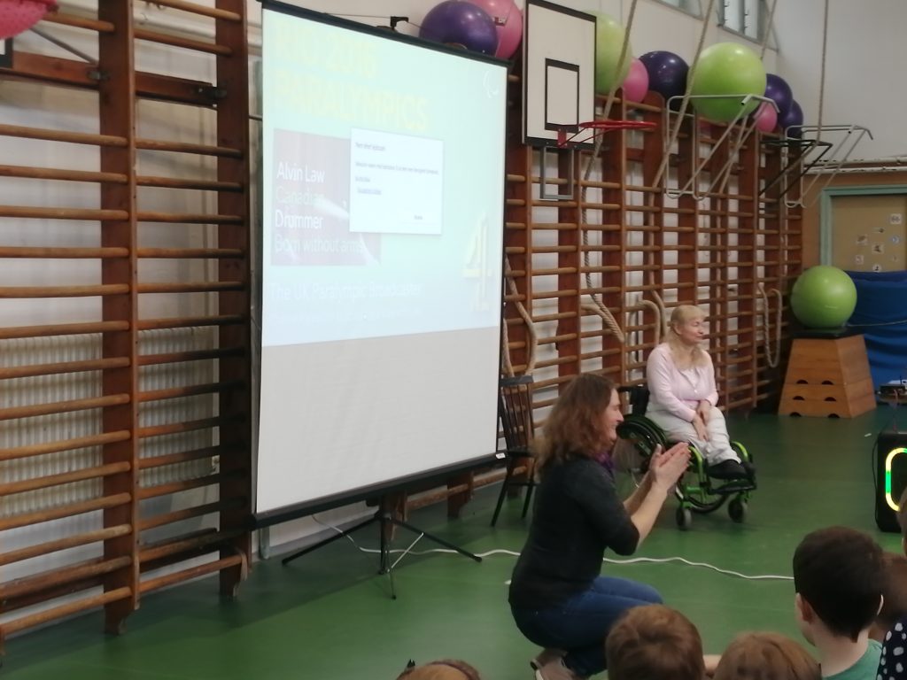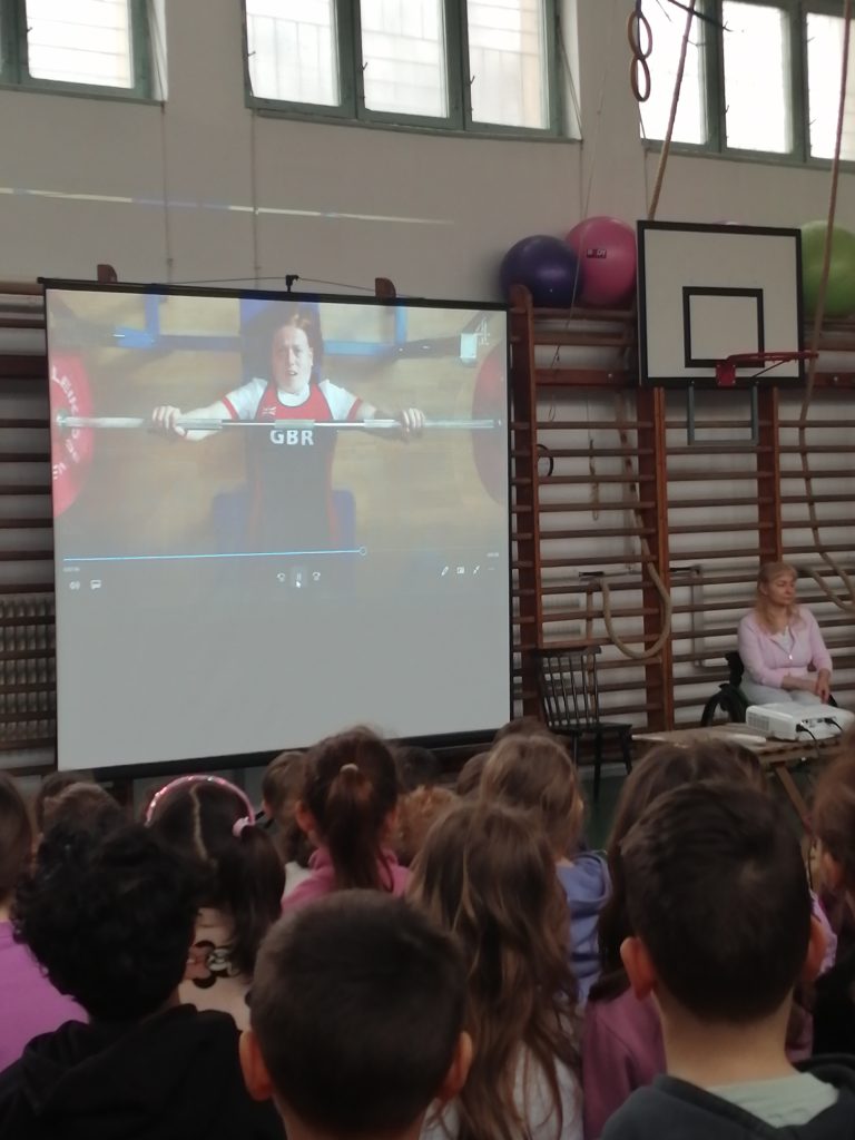 Második előadónk Engelhardt Katalin, aki paralimpiai bajnok, világbajnok, kétszeres Európa-bajnok paraúszó, sportmenedzser. Az alsósok számára hozott rövid videóval indította a beszélgetést.