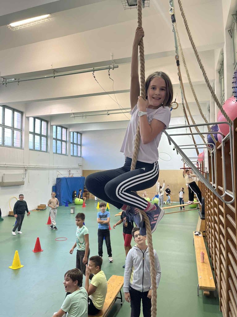 Iskolánk tornatermében vidám hangulatú, napindító sportfesztivált szerveztünk a felső tagozatos diákok számára. A program célja az volt, hogy mozgással és jókedvvel kezdjük a napot. Hat különböző állomást alakítottunk ki, ahol változatos mozgásos feladatok várták a gyerekeket. Szólt a zene, és rengeteg sporteszközt vittünk be a szertárból, hogy minél élvezetesebb legyen a közös mozgás.