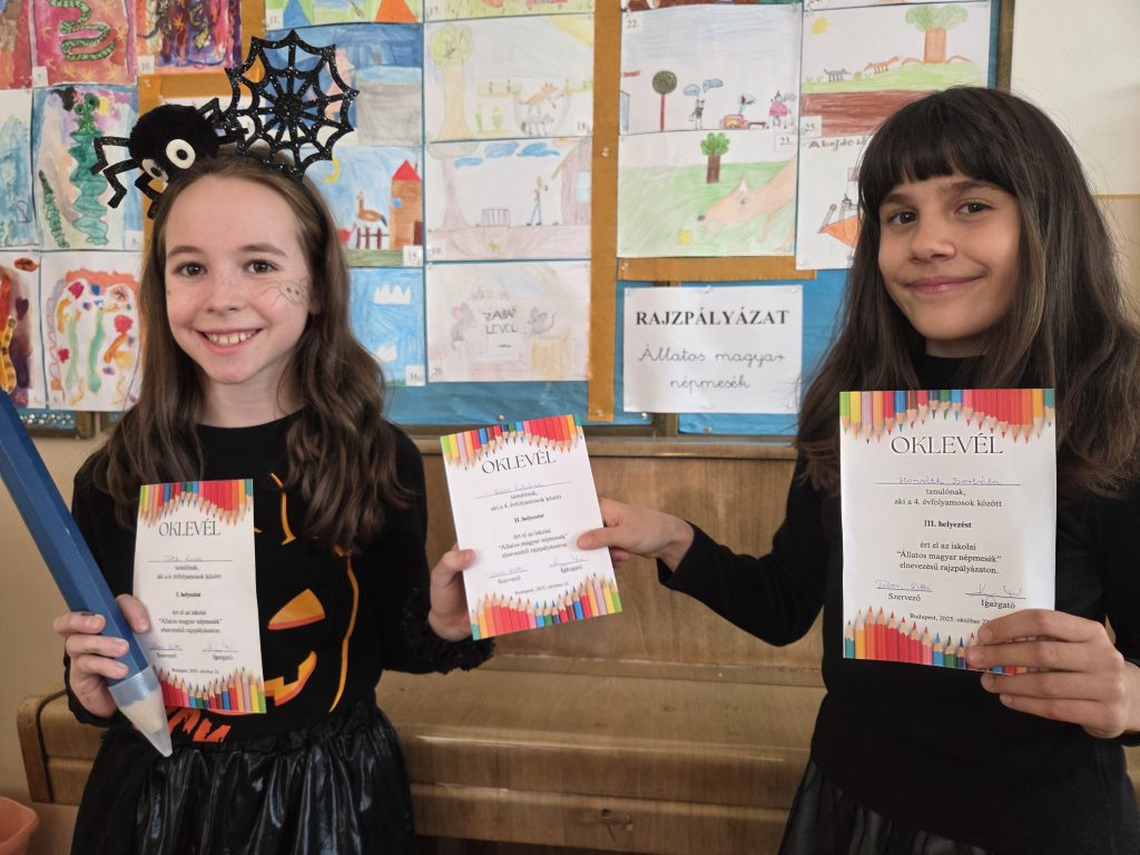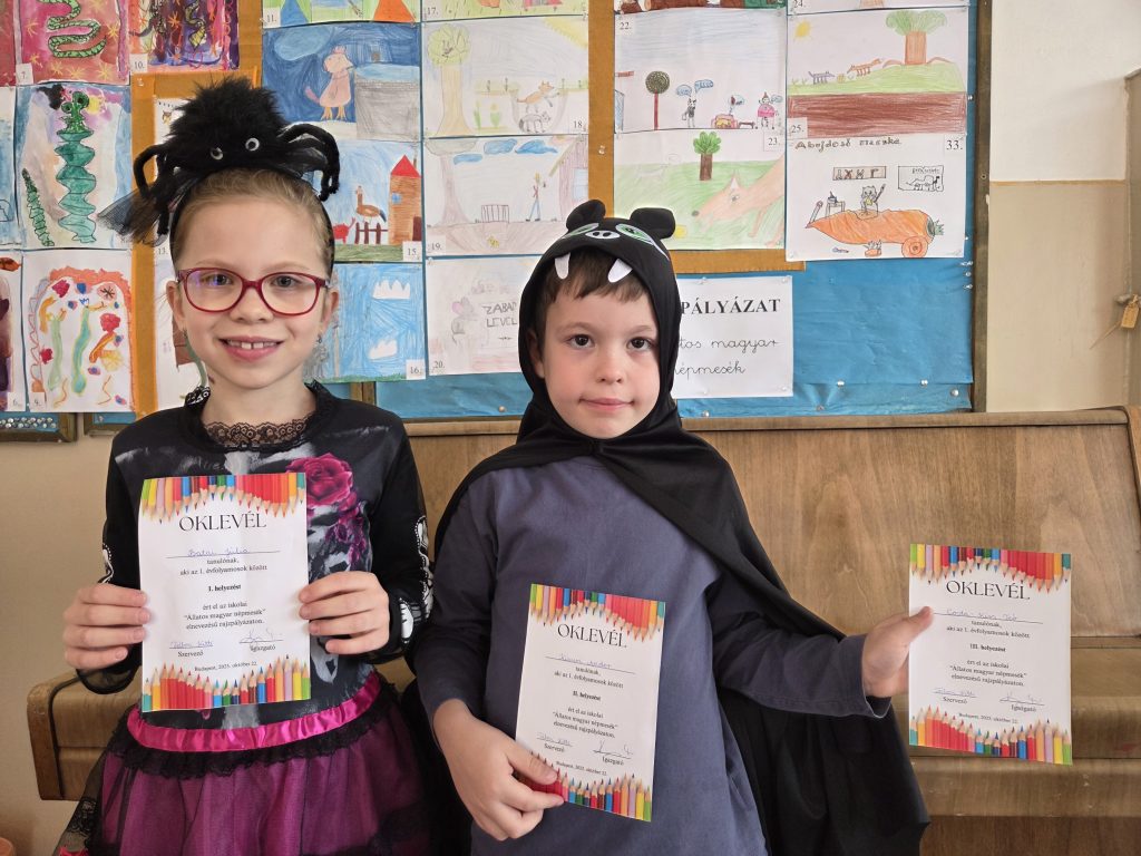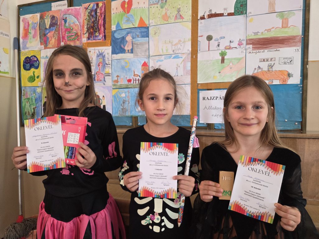 Az eredményhirdetésre az őszi szünet előtti utolsó tanítási napon került sor – ugyanazon a napon, amikor iskolánkban a Halloween-délutánt is tartottuk, így a gyerekek jelmezben vehették át az elismeréseket.