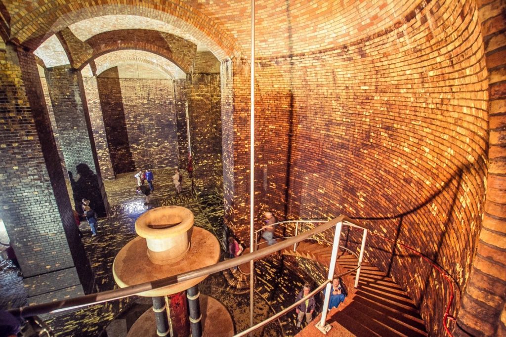 A víz a két, „szökőkútnak” is beillő márvány beömlőnyíláson áramlik be a csarnokba, mikor feltöltik azt, és körülbelül 12 óra alatt éri el a kívánt szintet. Igazán érdekes érzés egy ilyen monumentális, föld alatti épület gyomrában középen állva azon tűnődni, hogy micsoda mérnöki munka kellett ahhoz, hogy ma is működjön az intézmény. A kőbányai telep Ferihegytől Cinkotáig több százezer ember háztartását látja el a Szentendrei-sziget csápos kútjaiból származó vízzel.