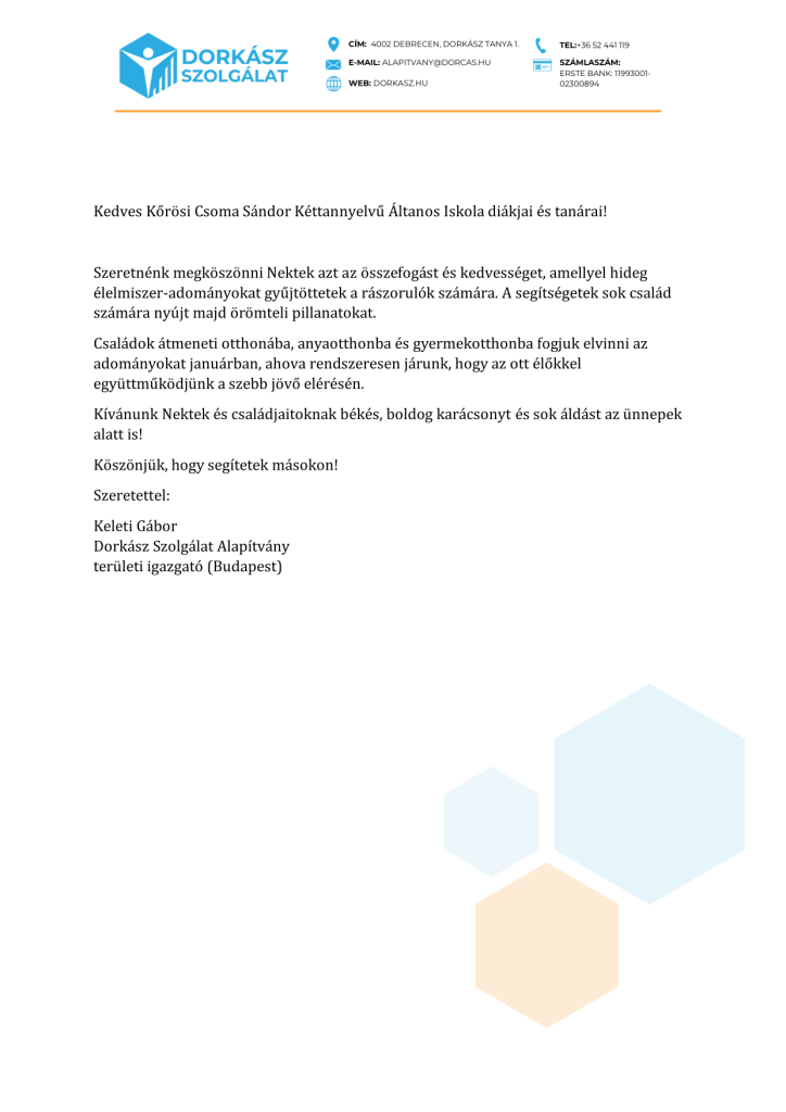 Szívből köszönjük a sok-sok adományt és az összefogást; az összegyűjtött élelmiszereket eljuttattuk a Dorkász segélyszervezethez, akiknek köszönőlevele csatolva olvasható.